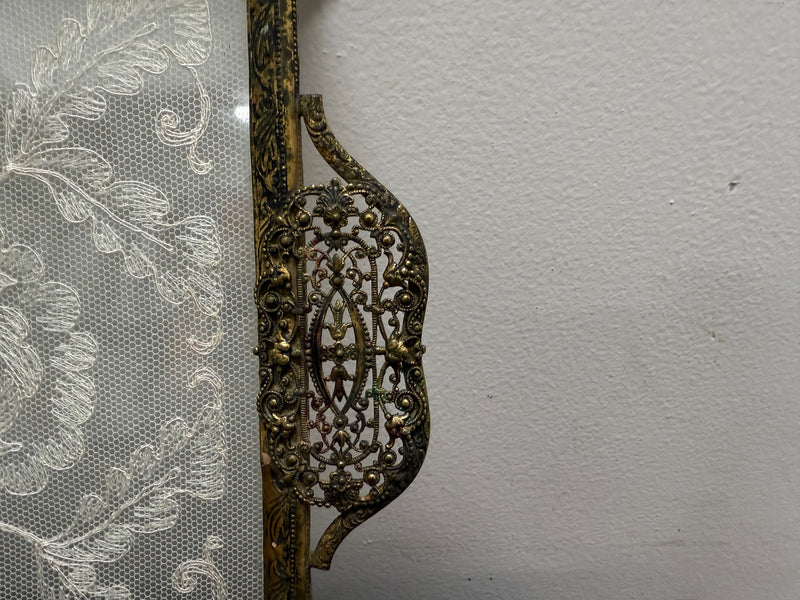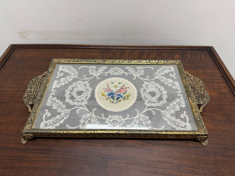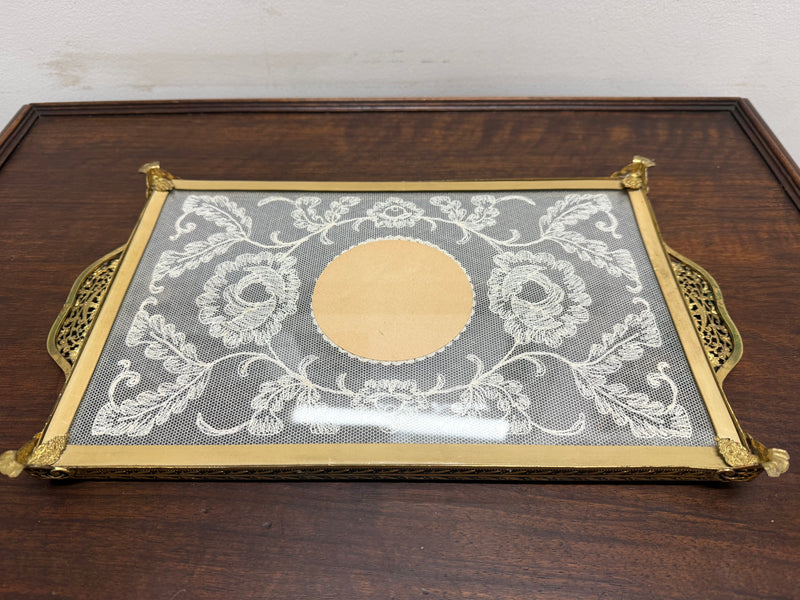 Vintage Glass Lace Petit Point Dressing Table Brass Tray