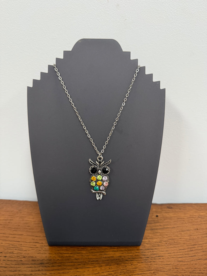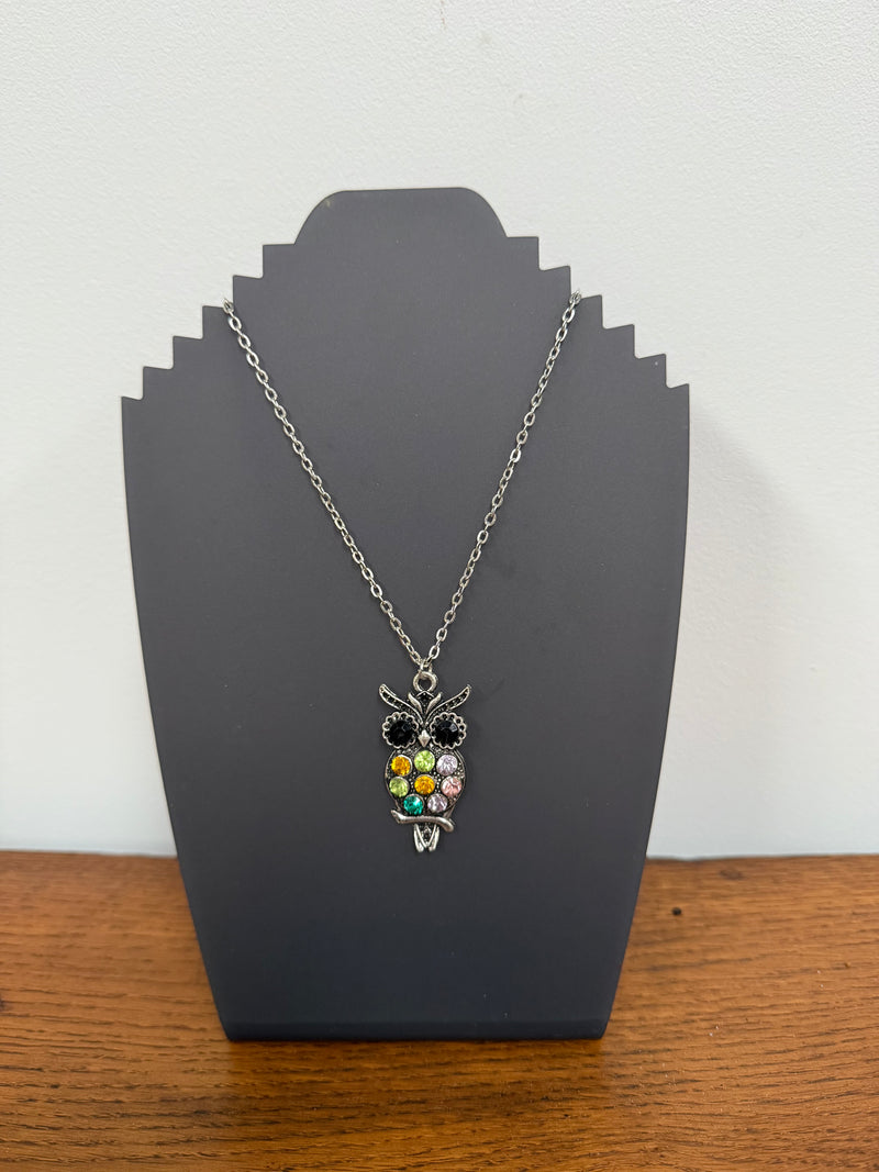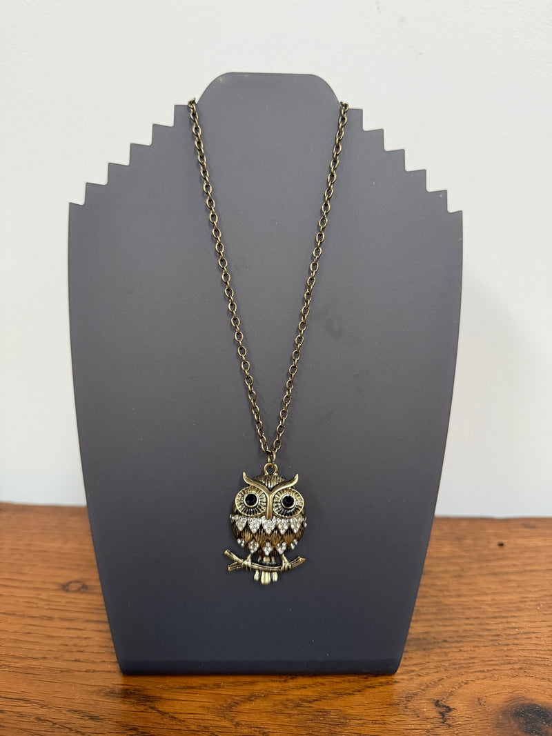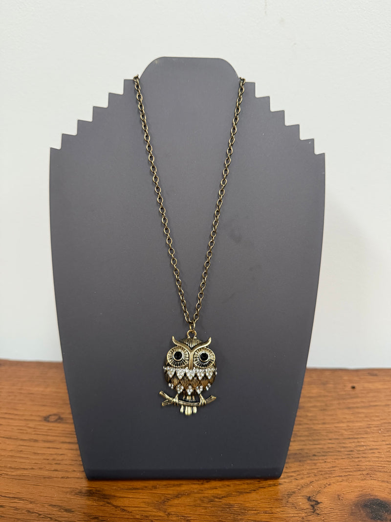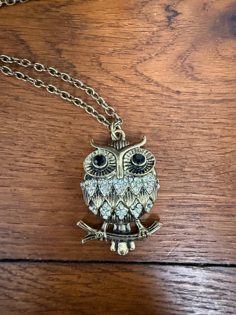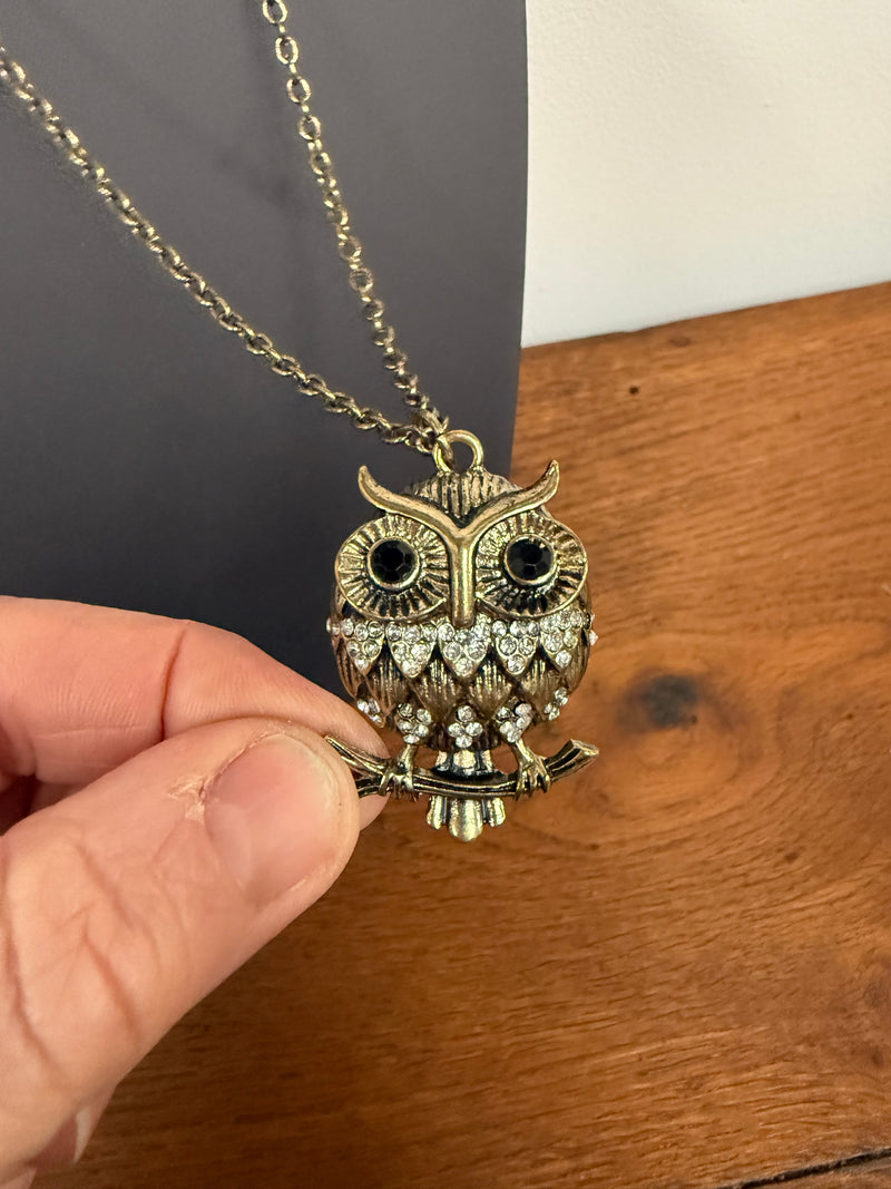 Vintage gold coloured owl pendant with black eyes and diamontes and chain. In good original condition. Please see photos as they form part of the description. Chain is 88cm. Owl is 4.5cm.