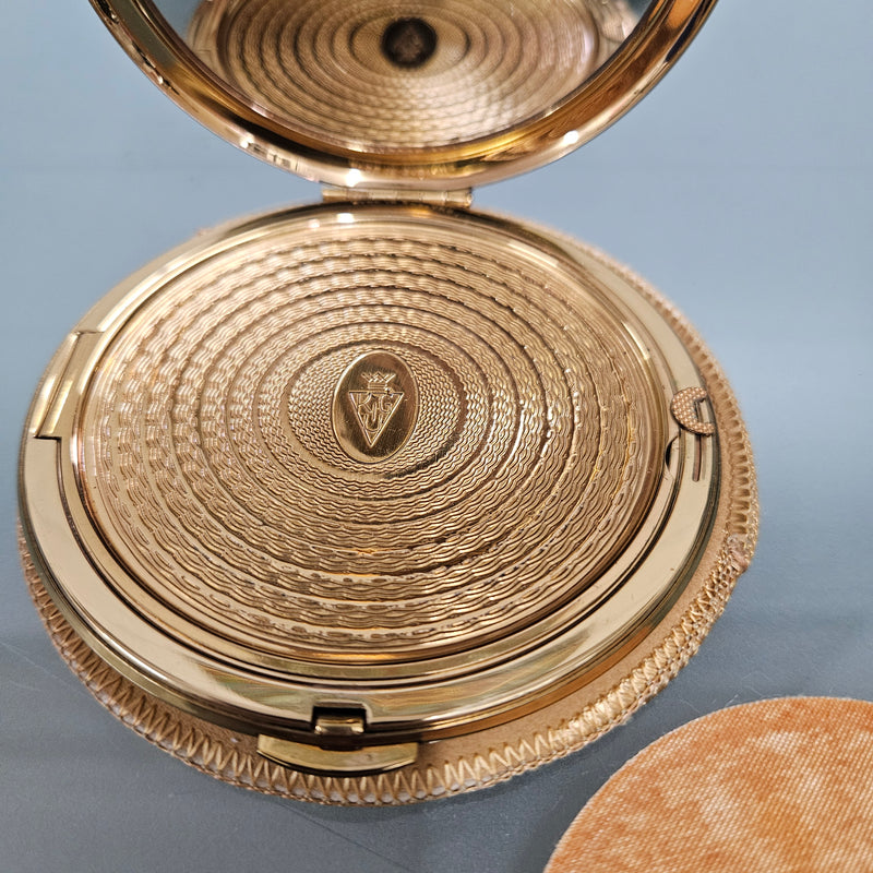 Vintage large guilhoche gold Kigu compact with two compartments and a mirror on the inside. It is in mint, seemingly unused condition. Please see photos as they form part of the description.