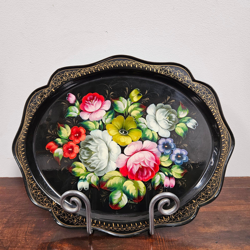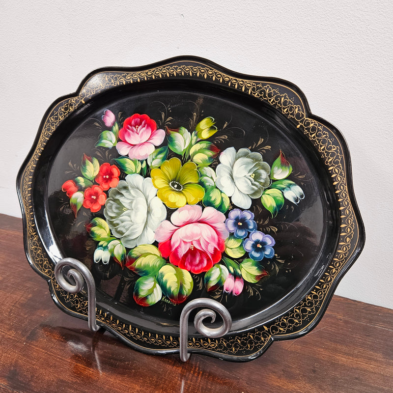 Vintage Hand Painted Tin Tray With Vibrant Flowers
