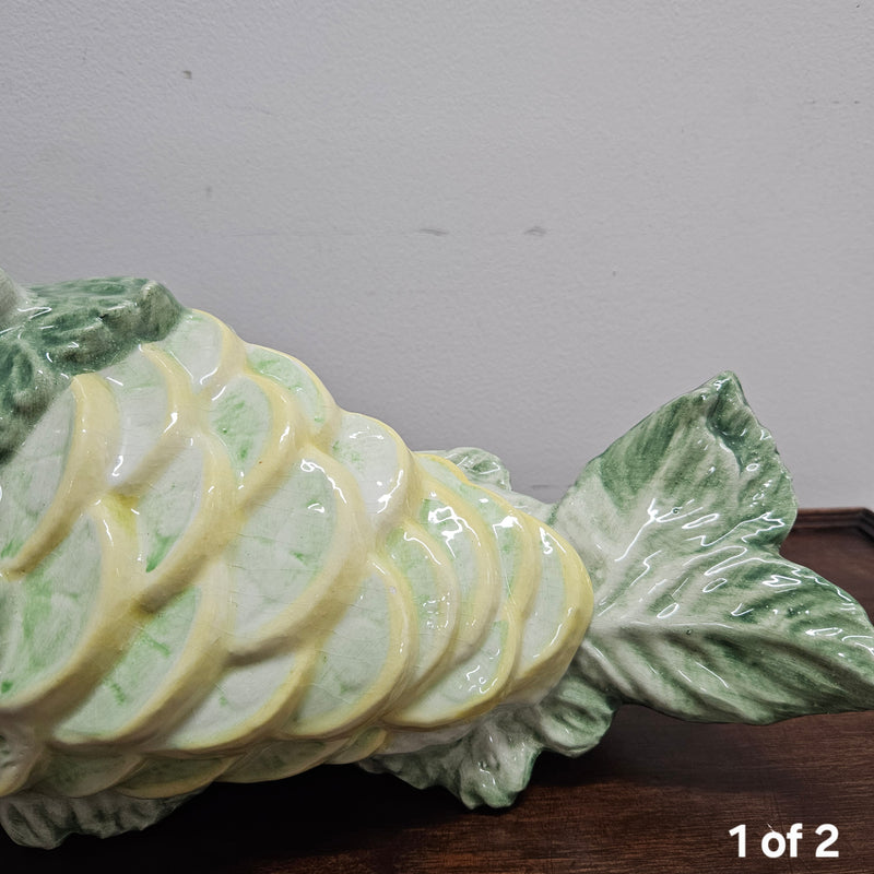 Fantastic vintage Italian hand painted majolica fish, featuring cabbage and lemons, covered dish or tureen. In good original condition. Please see photos as they form part of the description. This item is one of two and price is per fish / Tureen