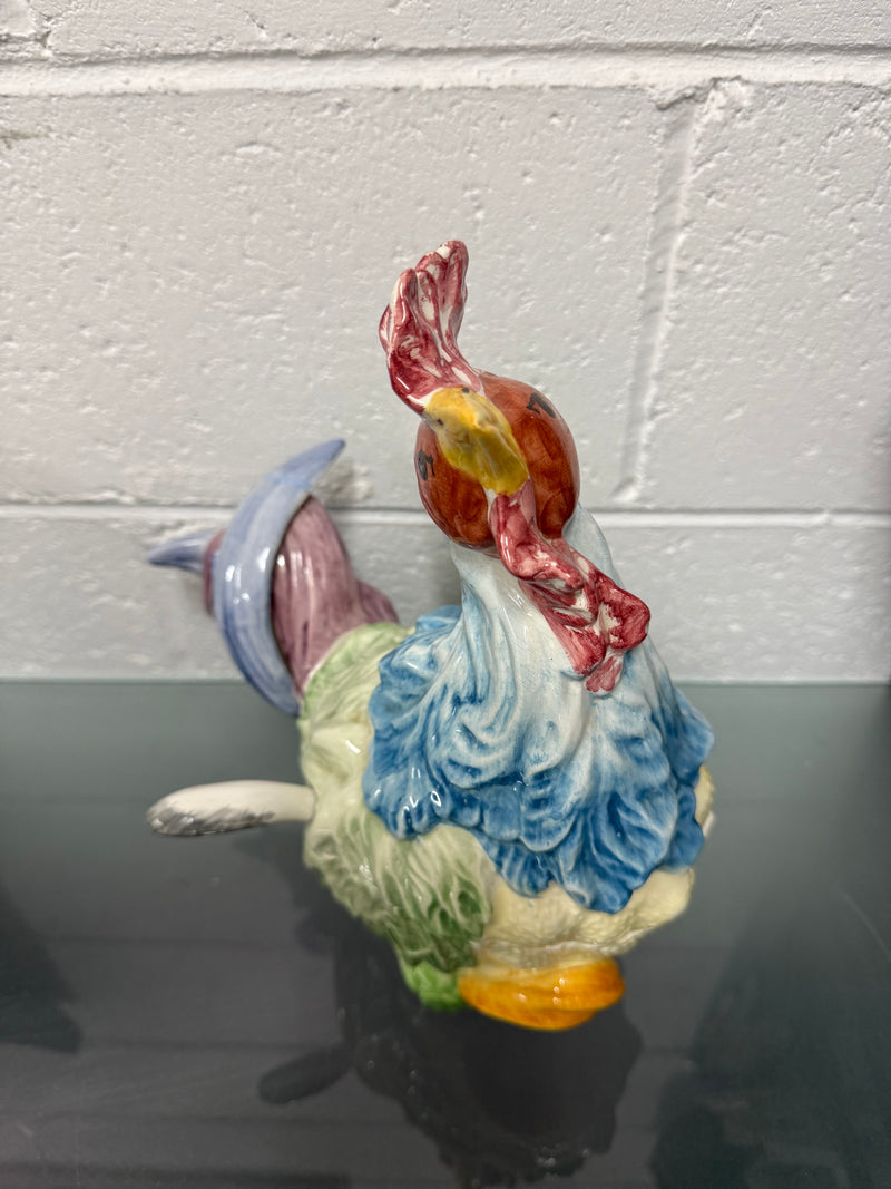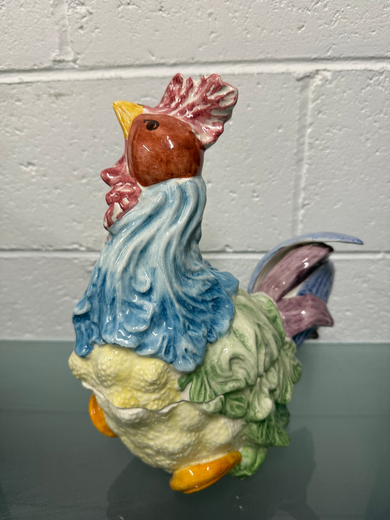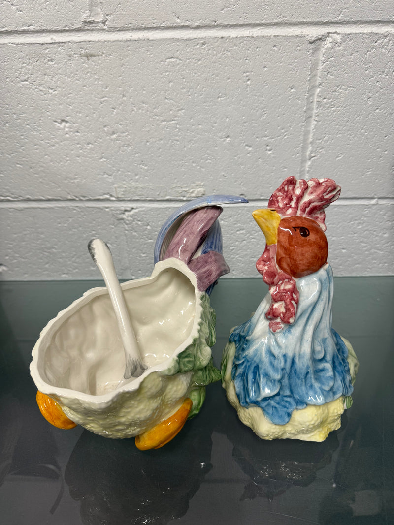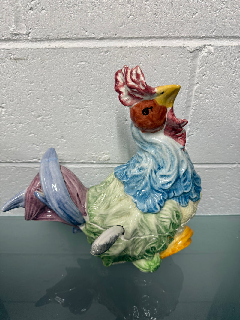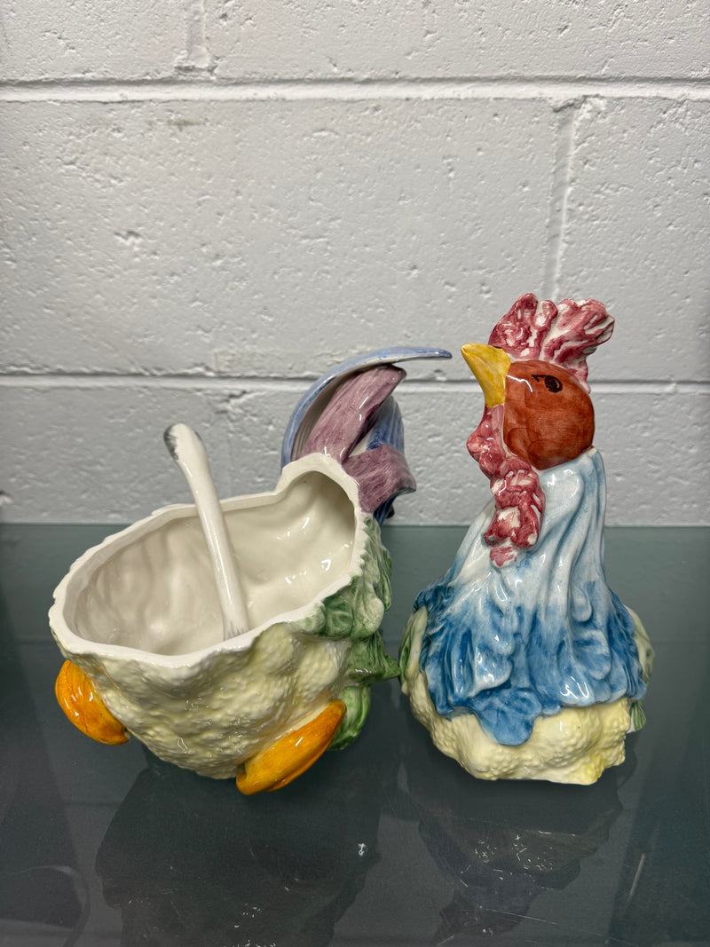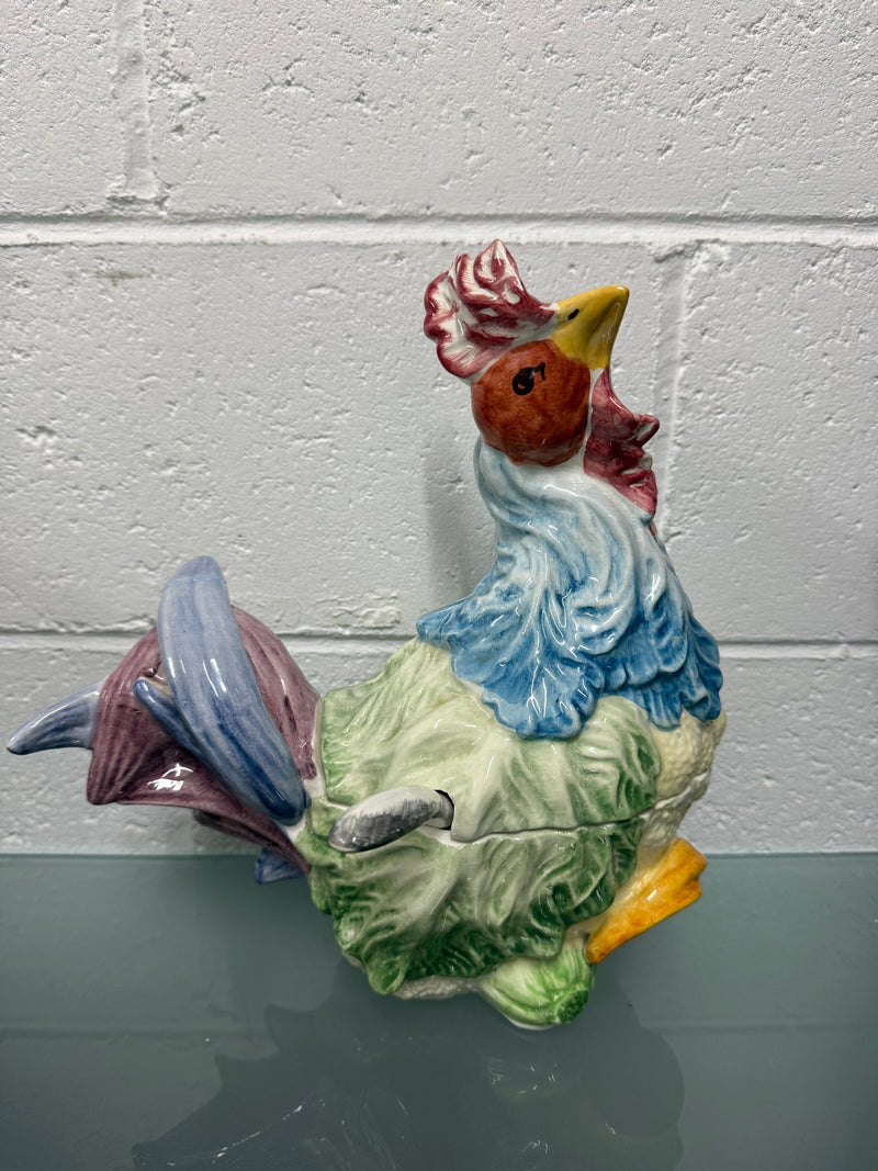 Stunning hand painted Vintage Majolica chicken tureen with three parts, the base, lid and spoon. It is in as found condition with a repair to the tail, it is otherwise in good original condition. Please see photos as they form part of the description.