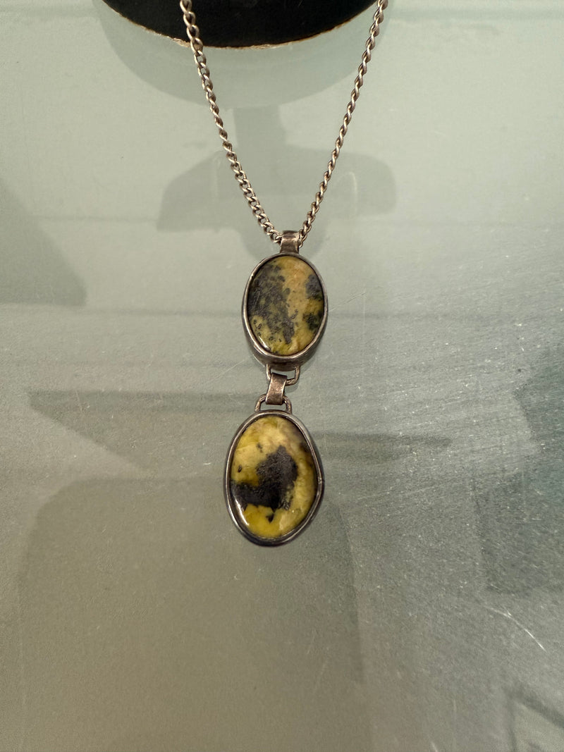 Lovely pendant of two moss agate discs set in silver. Includes a chain. In good original condition. Please see photos as the form part of the description