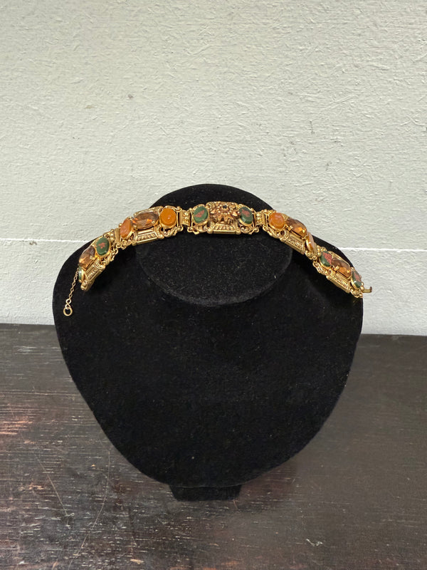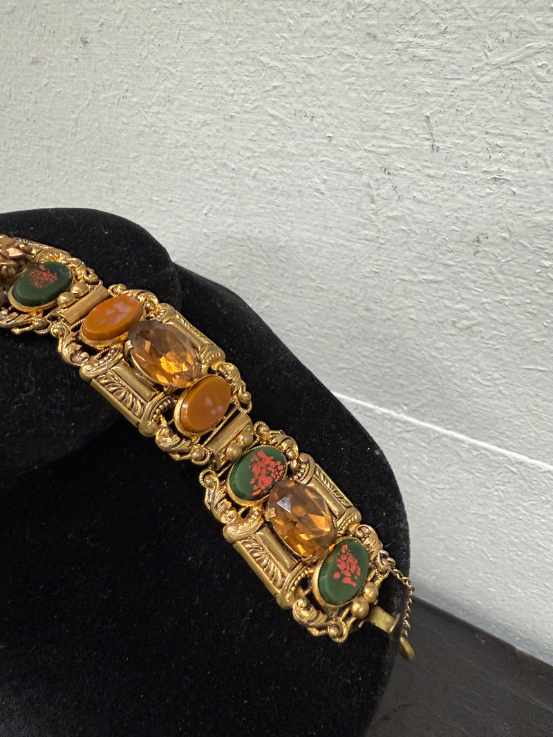 Stunning Vintage Czechoslovakia multi stone bracelet on a gilt metal filigree base. In good original condition. Please see photos as they form part of the description.