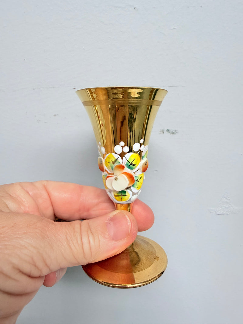 Stunning vintage opaline, gilt and enamel decorated glass decanter/liqueur bottle set with six glasses, it is in good original condition. Please see photos as they form part of the description.