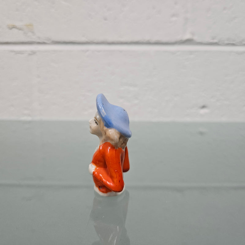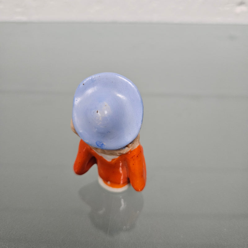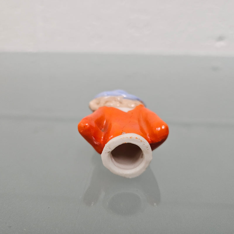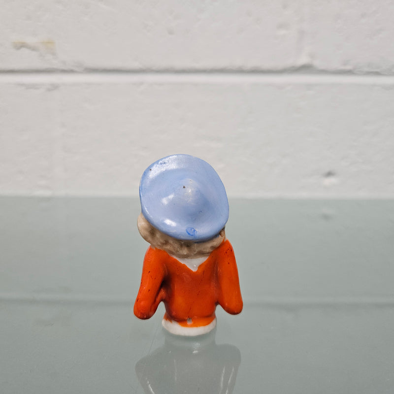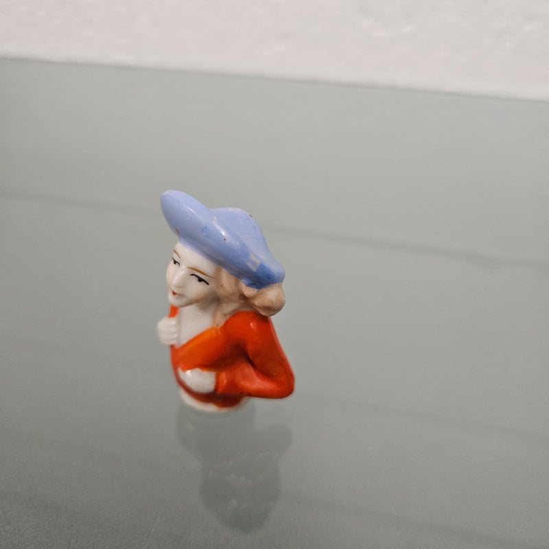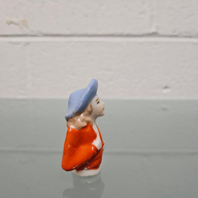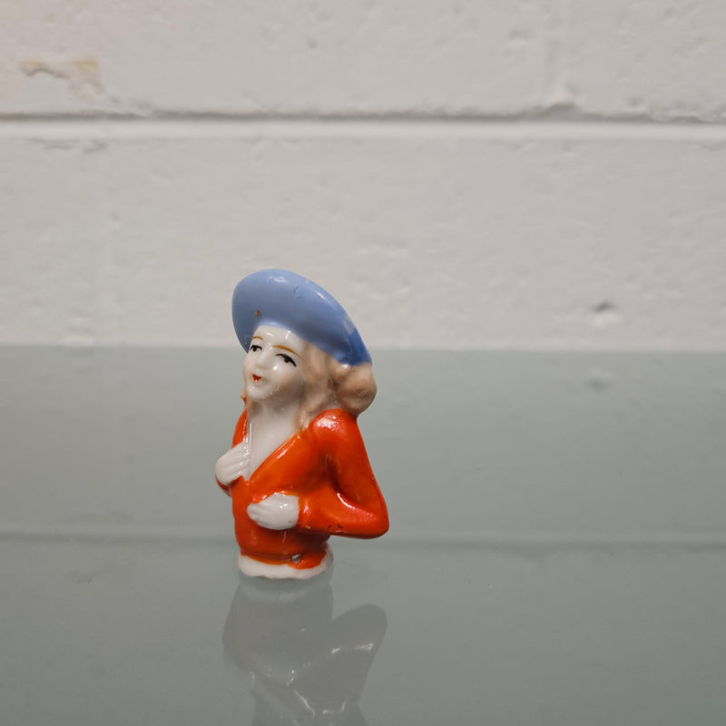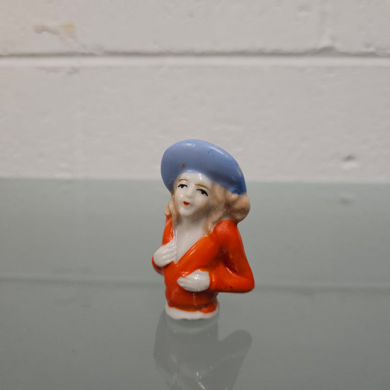 Beautiful vintage porcelain half doll with blue rim hat and orange blouse. It is in good original condition. Please see photos as they form part of the description.