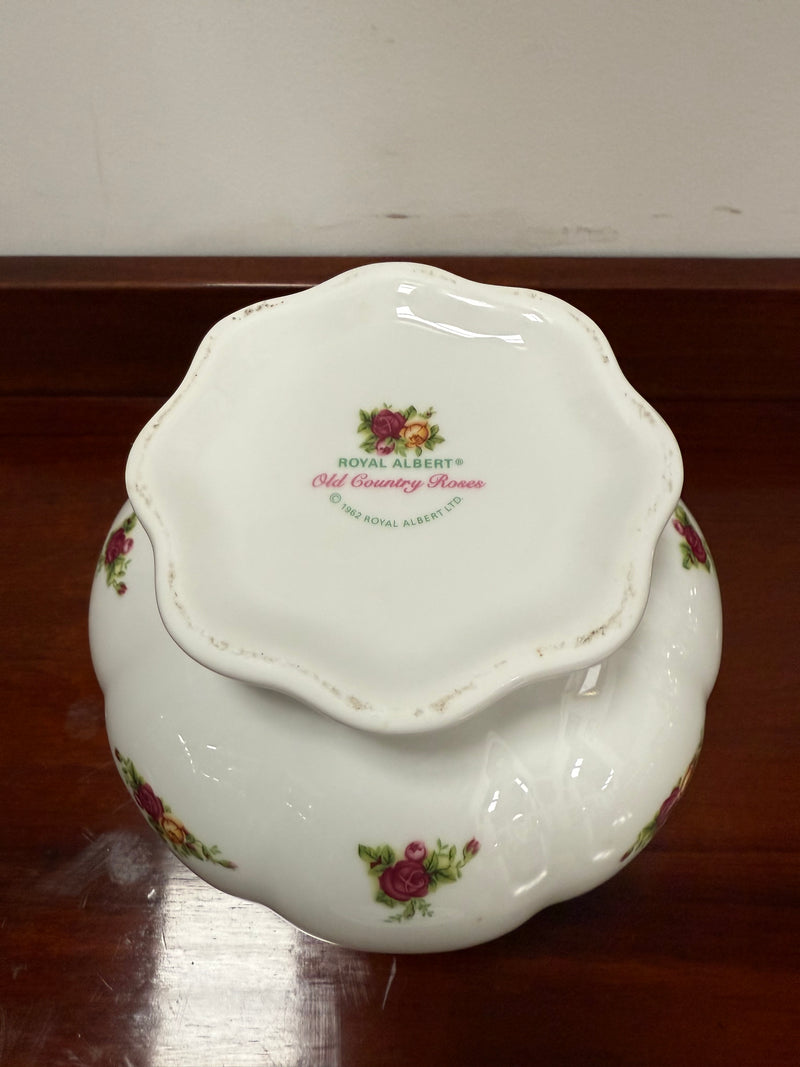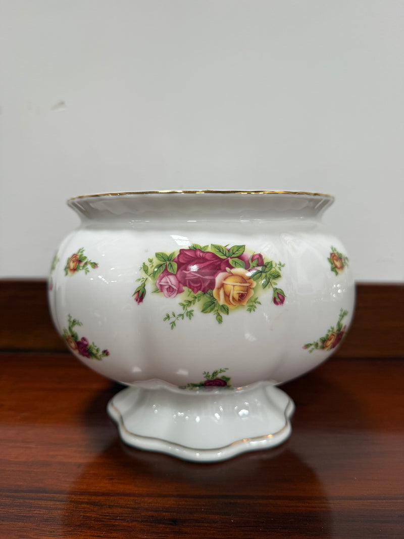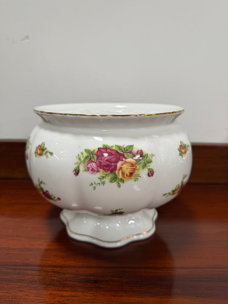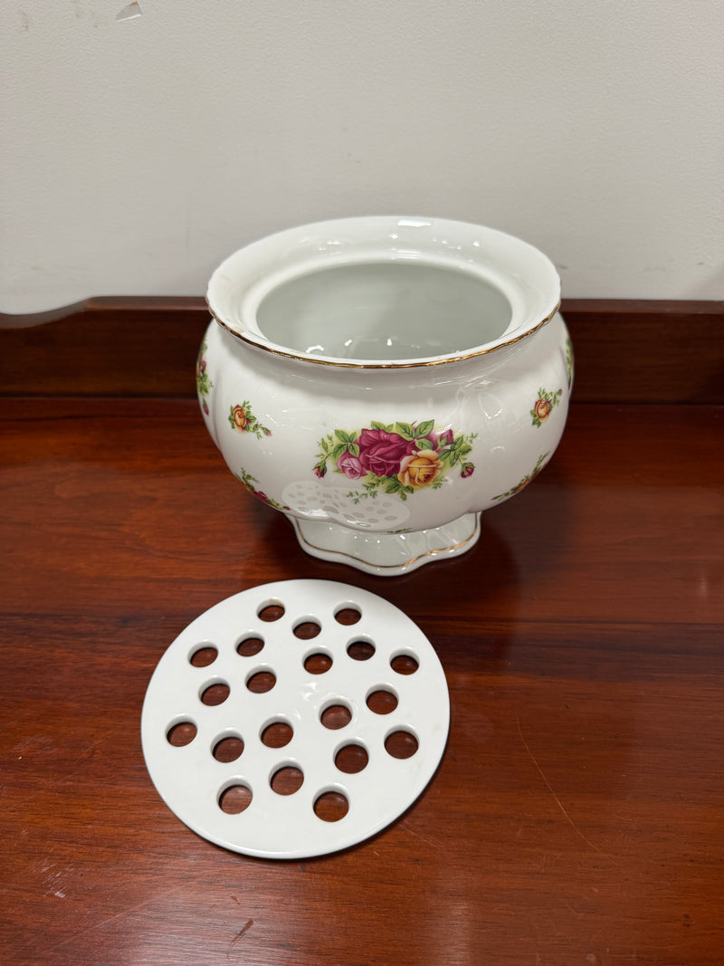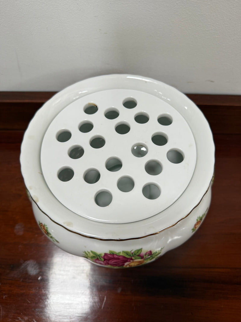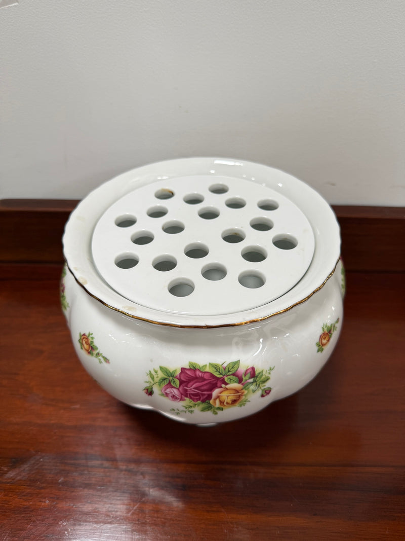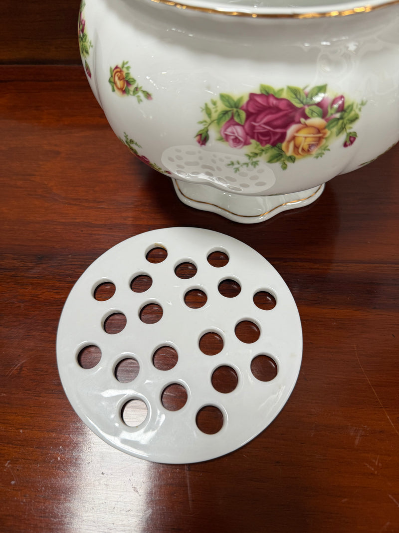 Vintage Royal Albert "Old Country Roses" round flower vase with pierced insert. In good original condition. Please see photos as they form part of the description.