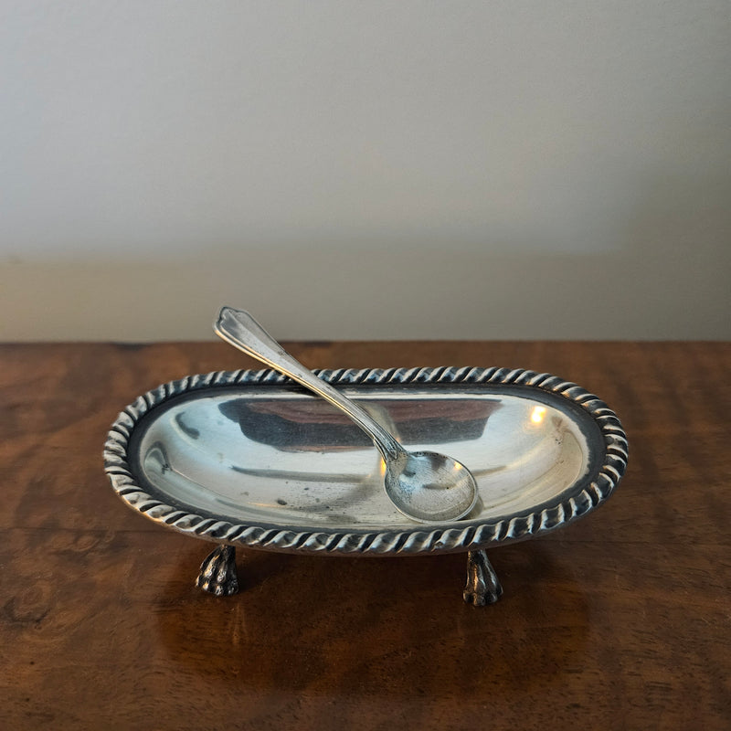 Vintage Silver (800) Salt Cellar and Spoon. It has lovely claw feet and is in good original condition. Please see photos as they form part of the description.