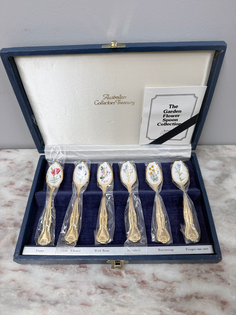 Vintage set 6 boxed garden flower enamel & gilt metal spoon set. In good original condition. Please see photos as they form part of the description.