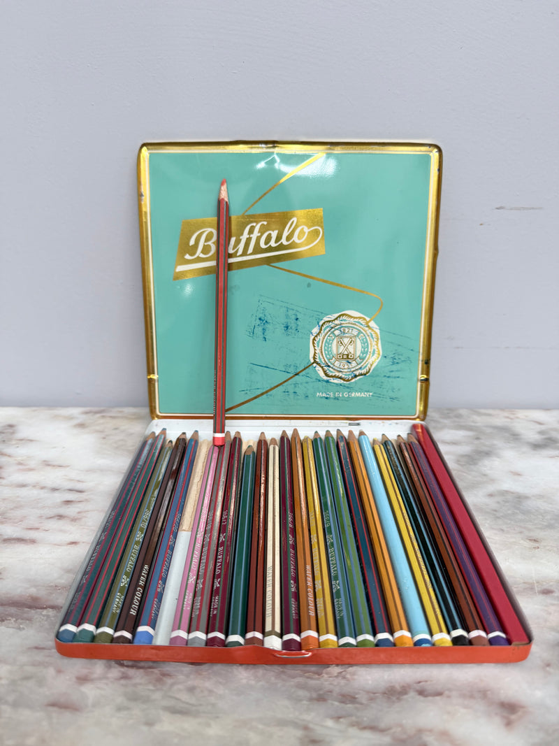 Vintage set of 1950's Aquarell Buffalo watercolour pencils in their original tin box, the box is in good original condition with some signs of age. The pencils have been used, although are in good condition and has plenty of use left in them or to keep as a collectors tin. Please see photos as they form part of the description.