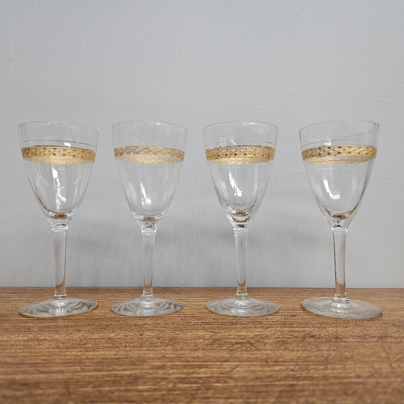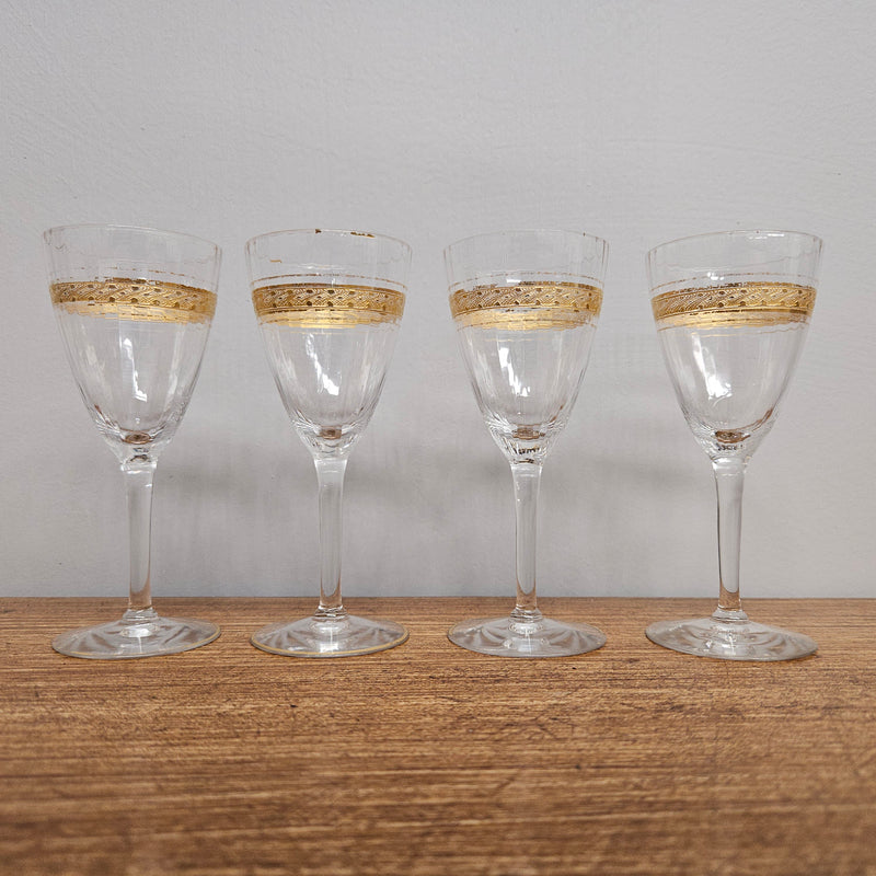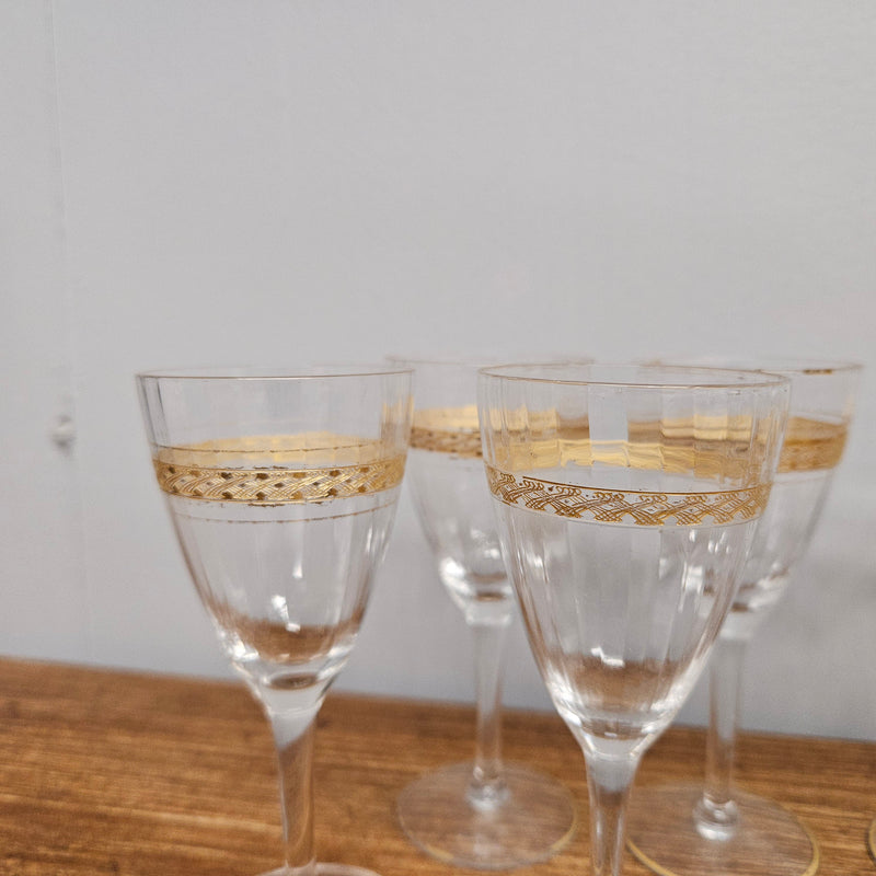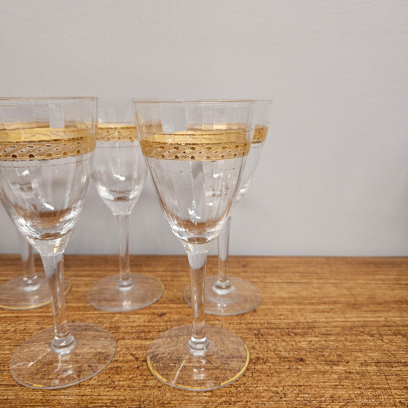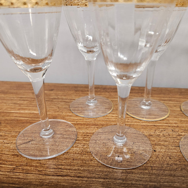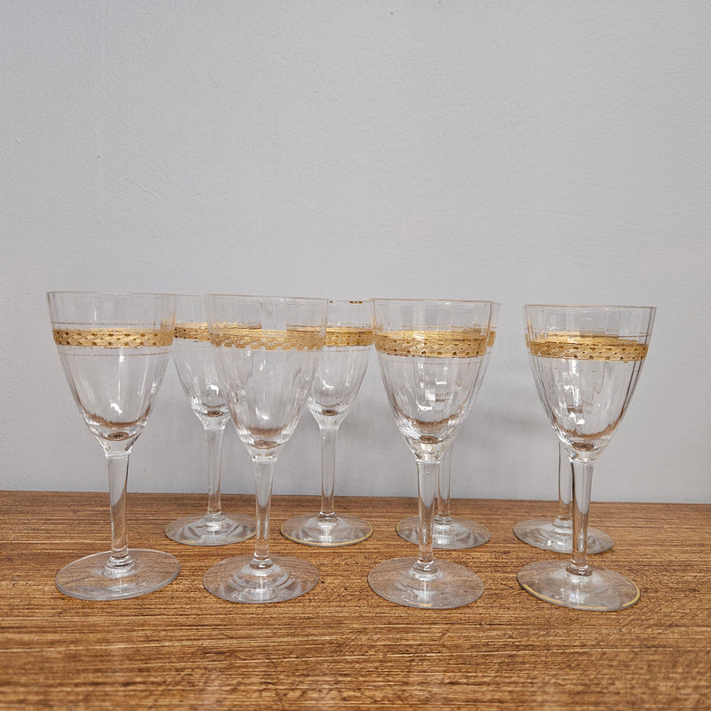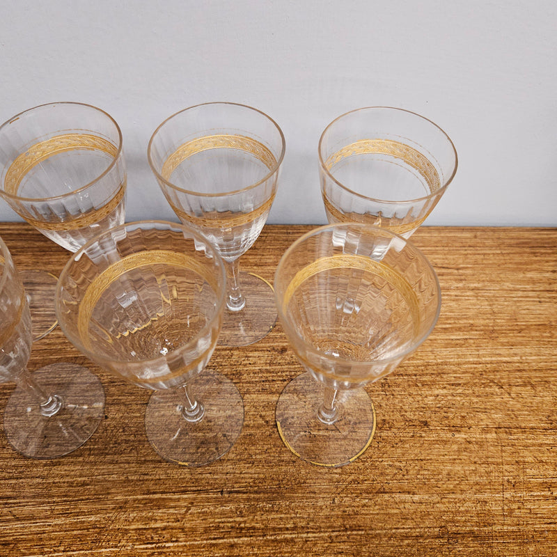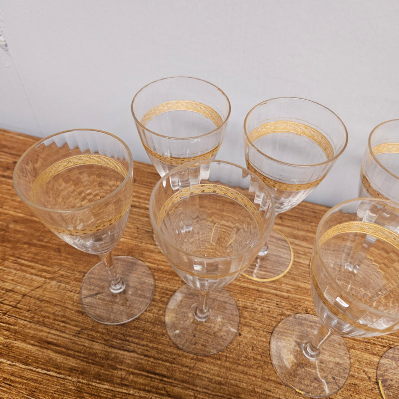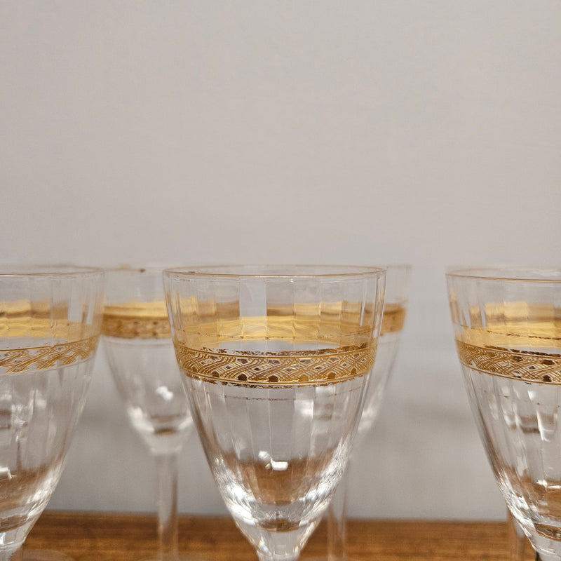 Vintage set of 8 stemmed sherry glasses with gold band. In good condition with some fading to the gilding and a chip to one base. Please see photos as they form part of the description,.