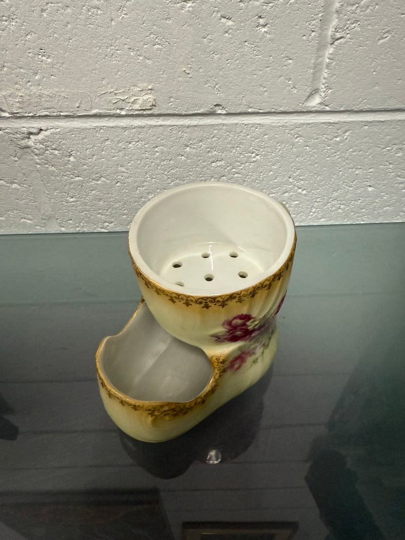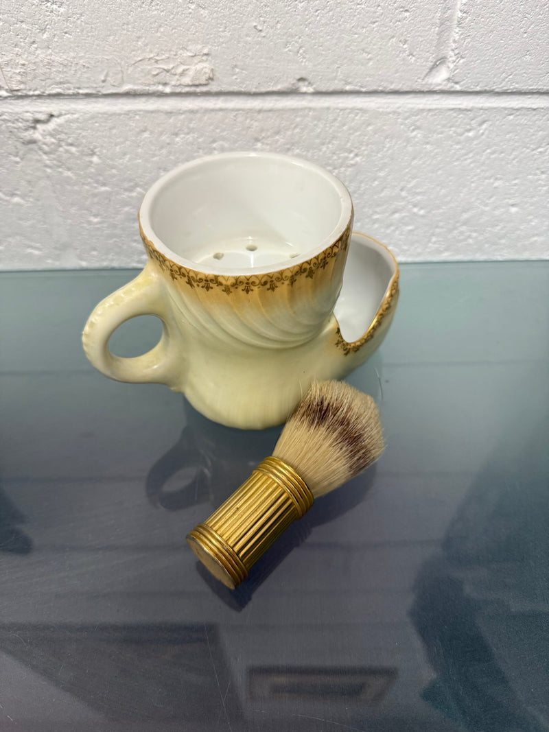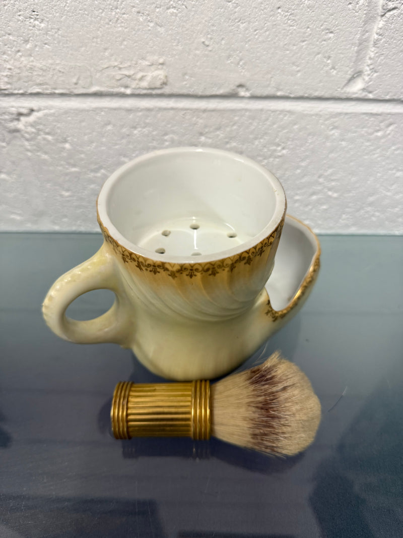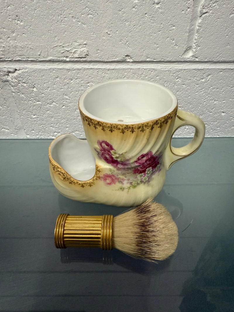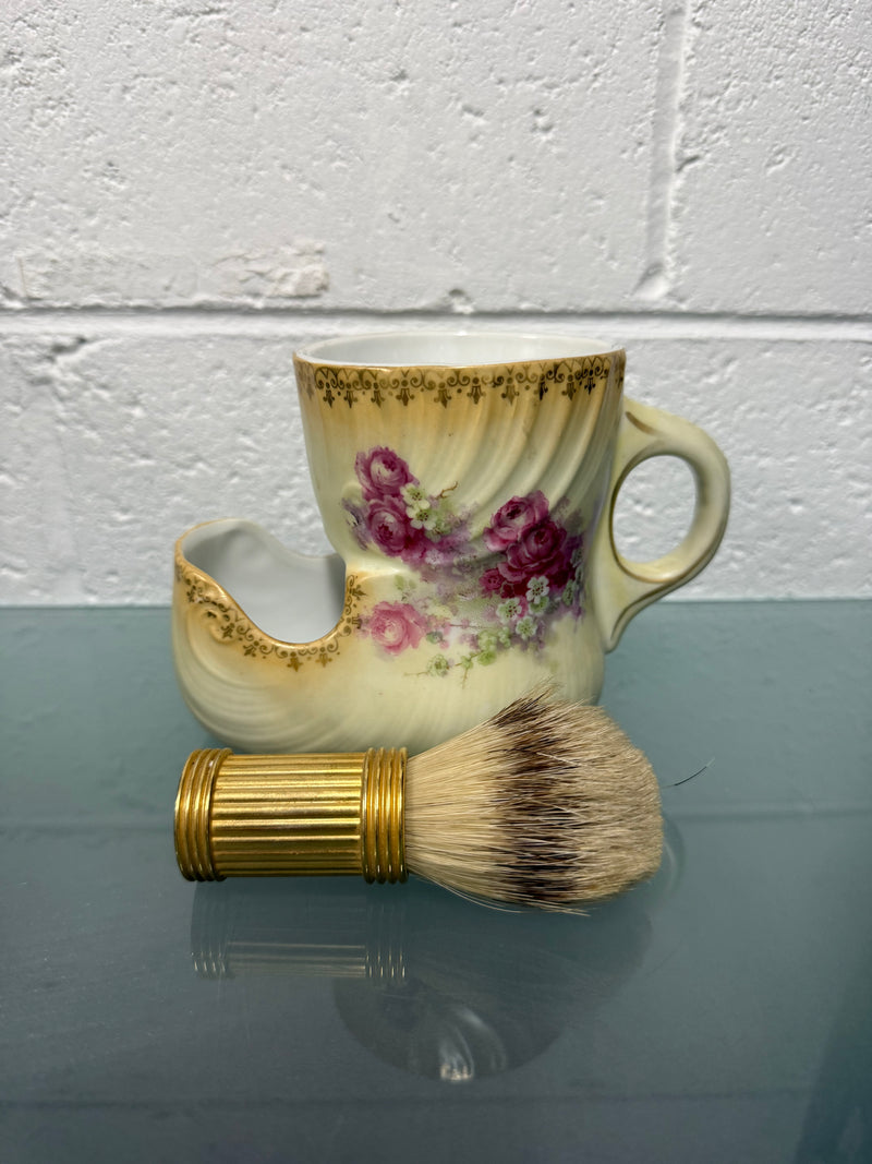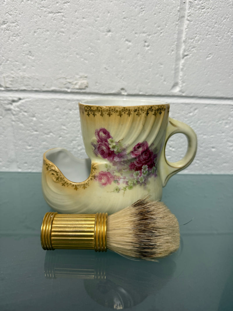 Pretty vintage shaving mug with floral decoration and shaving brush. In good original conditon. Please see photos as they form part of the description.