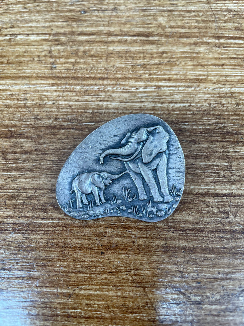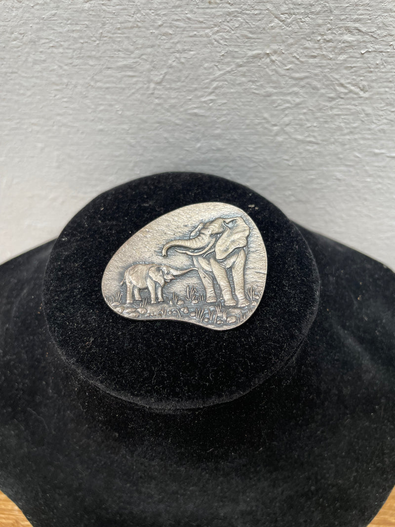 Vintage South African elephant brooch depicting mother and baby. Signed "Velia Silver Plated." In good original condition. Please see photos as they form part of the description.