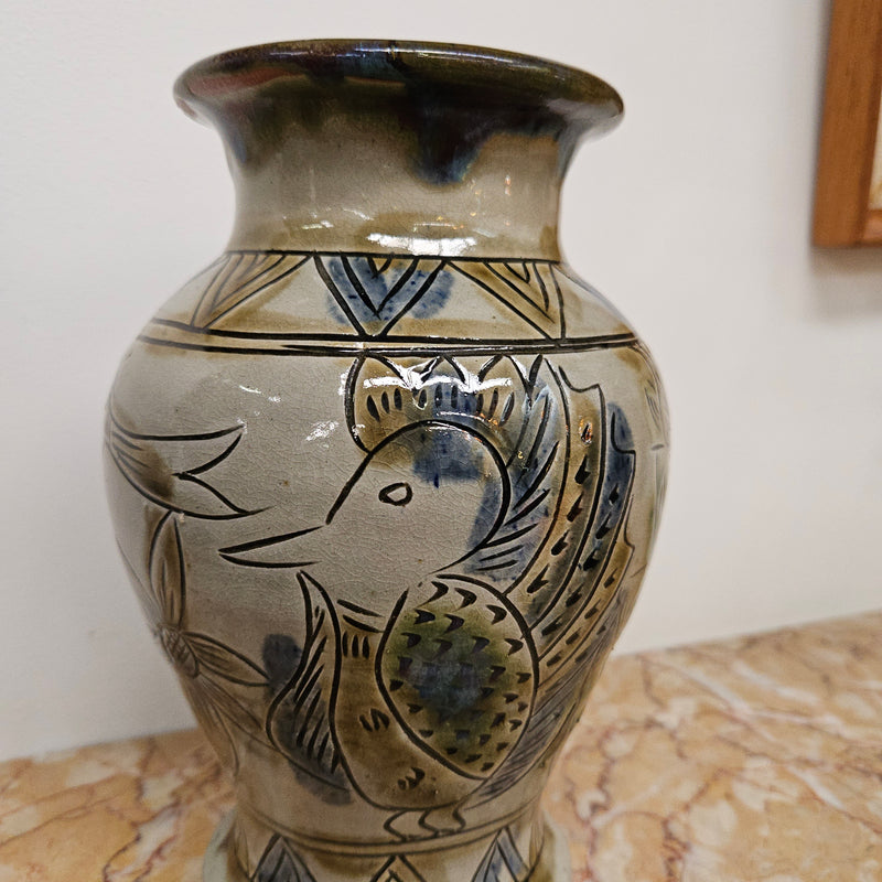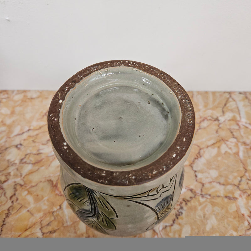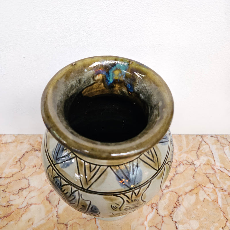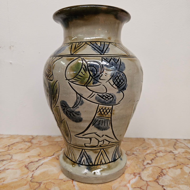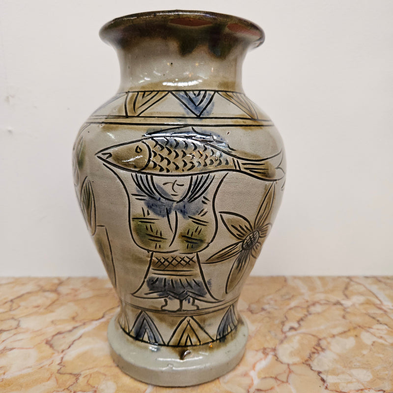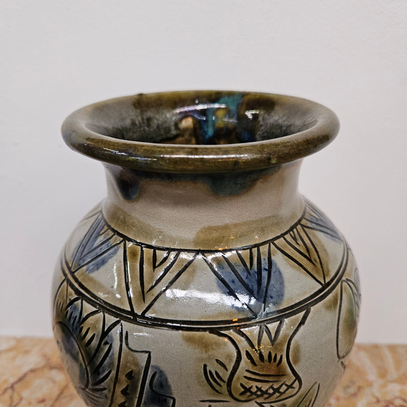 Lovely carved and multi coloured vintage studio pottery vase, it is in good original condition. Please see photos as they form part of the description.