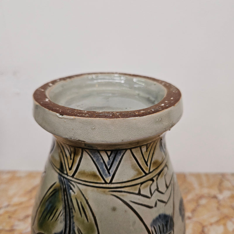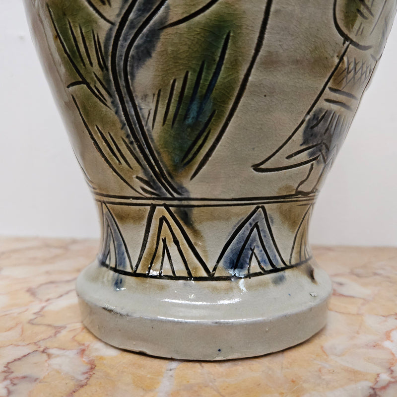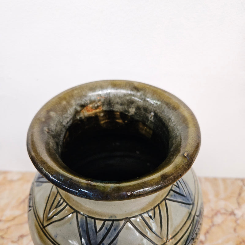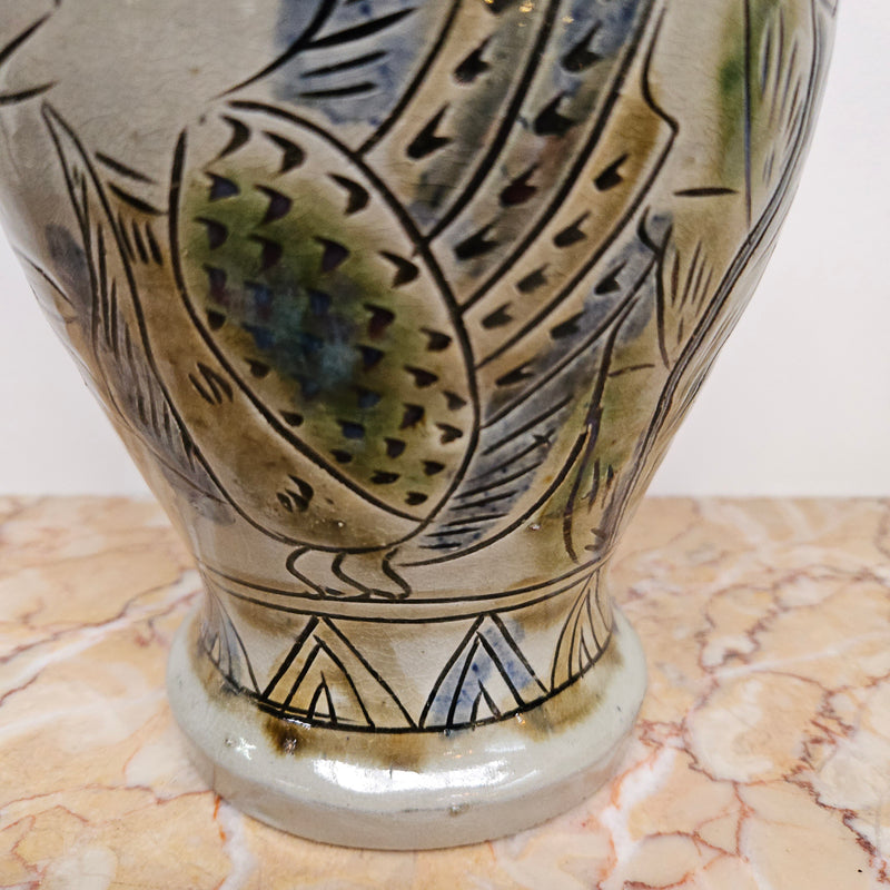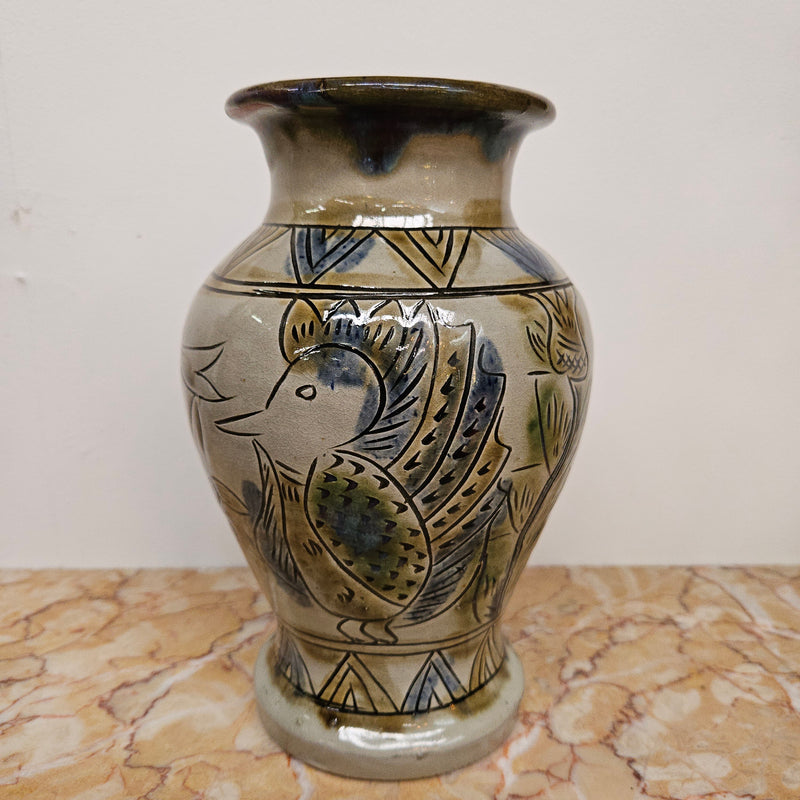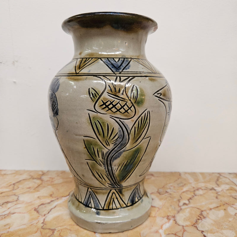 Lovely carved and multi coloured vintage studio pottery vase, it is in good original condition. Please see photos as they form part of the description.