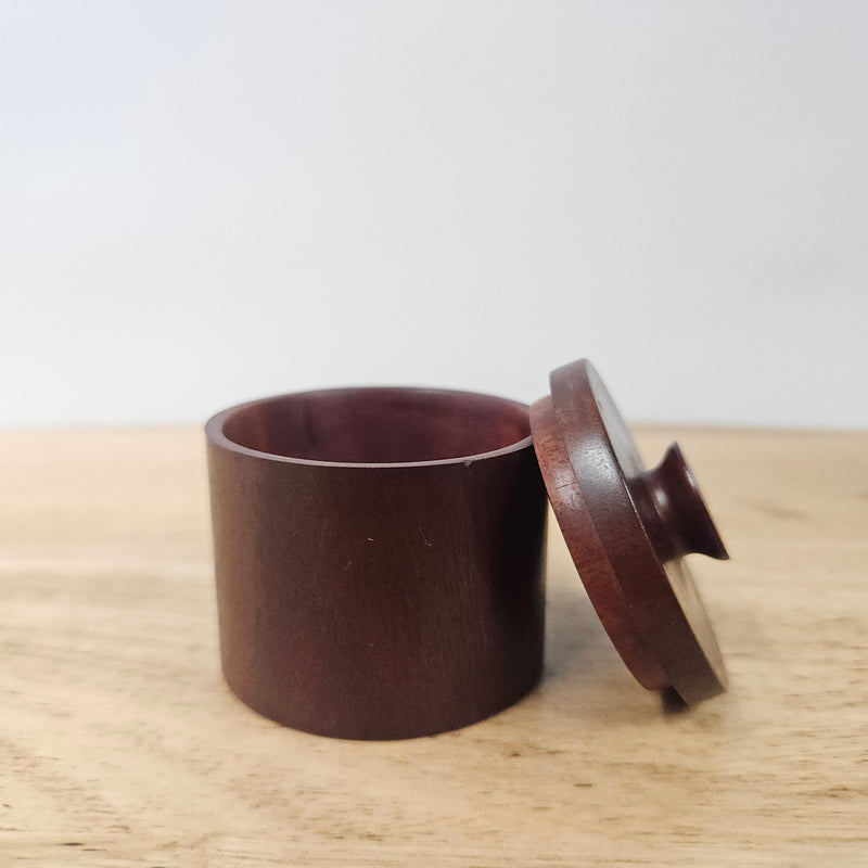 Vintage treen red gum cylindrical trinket box. In good condition. Please see photos as they form part of the description.