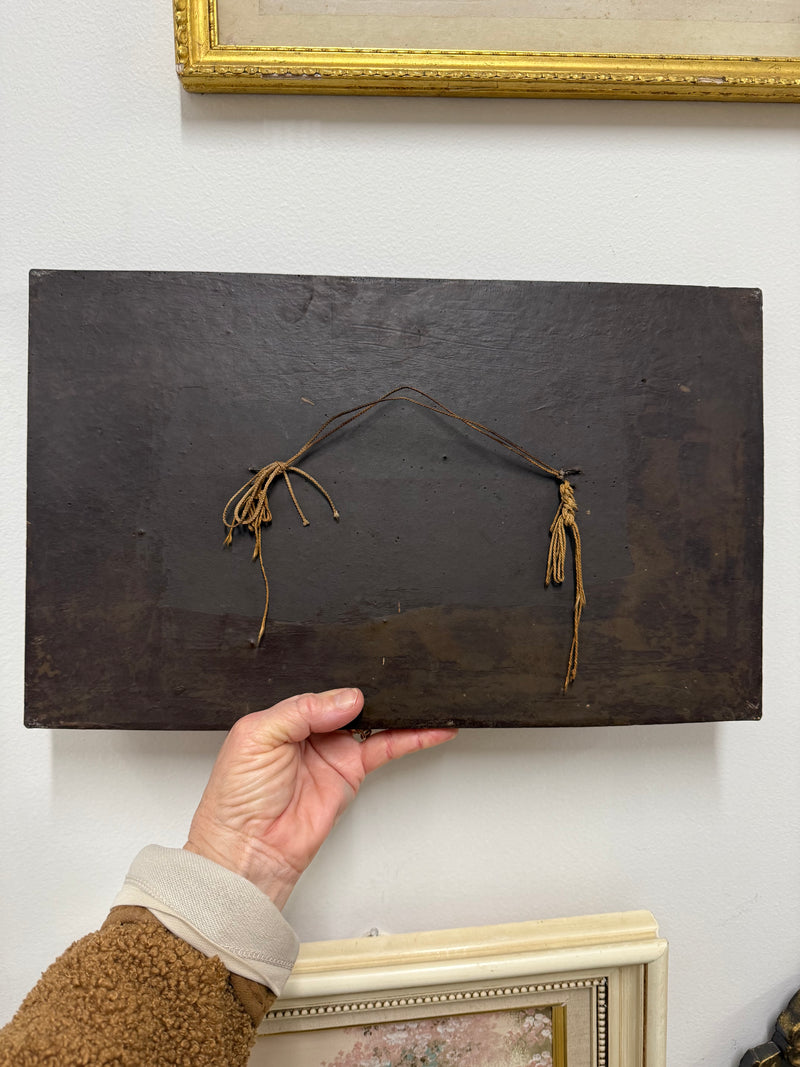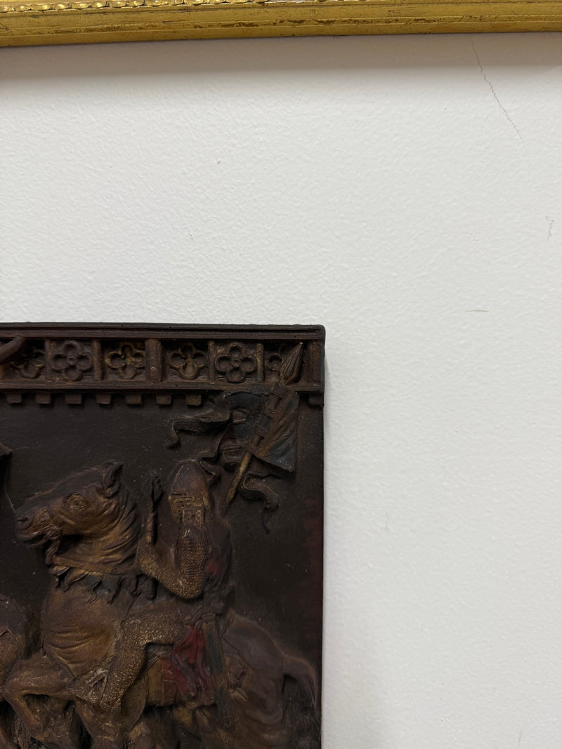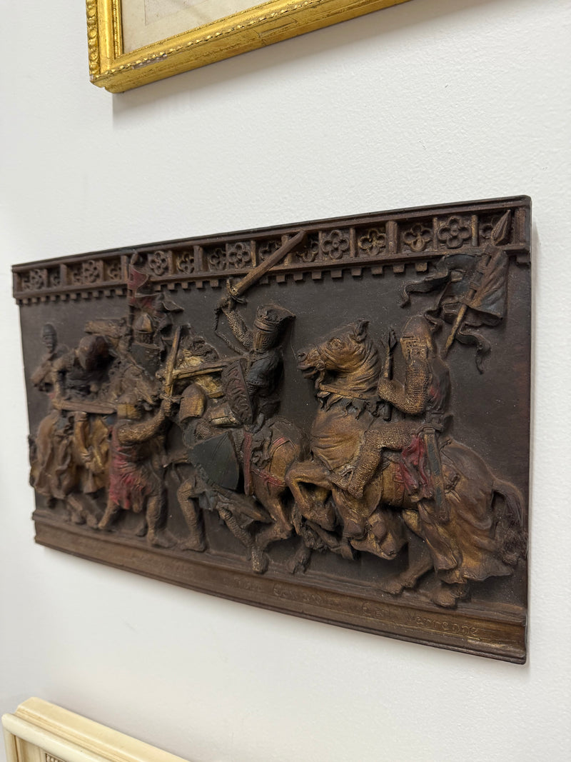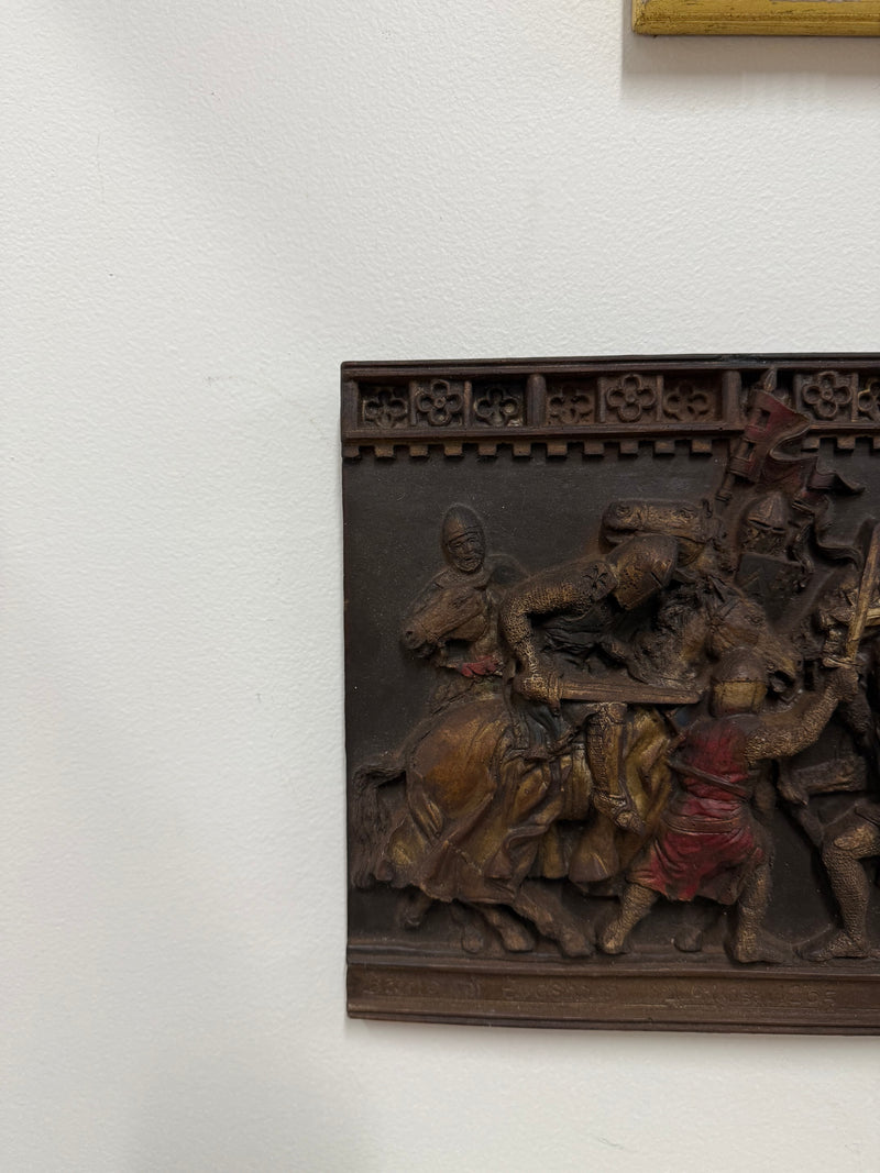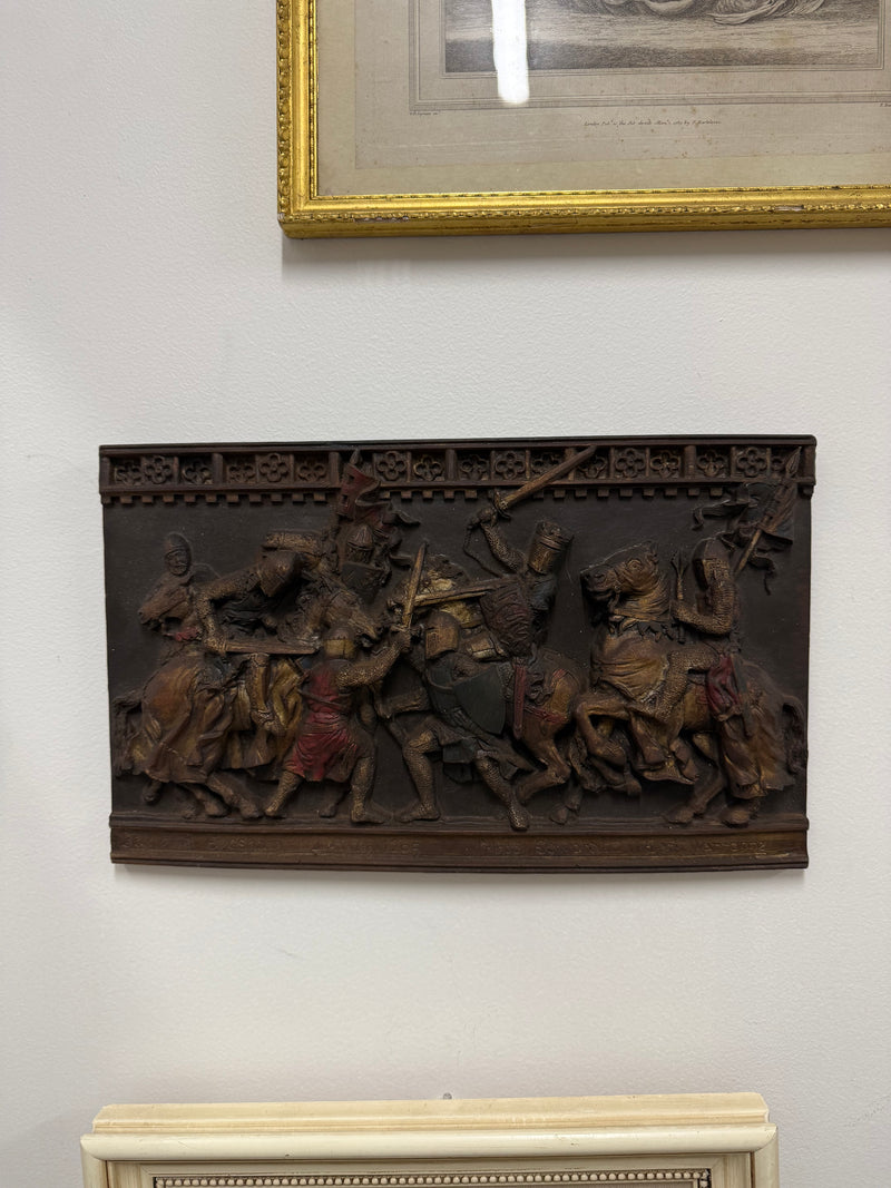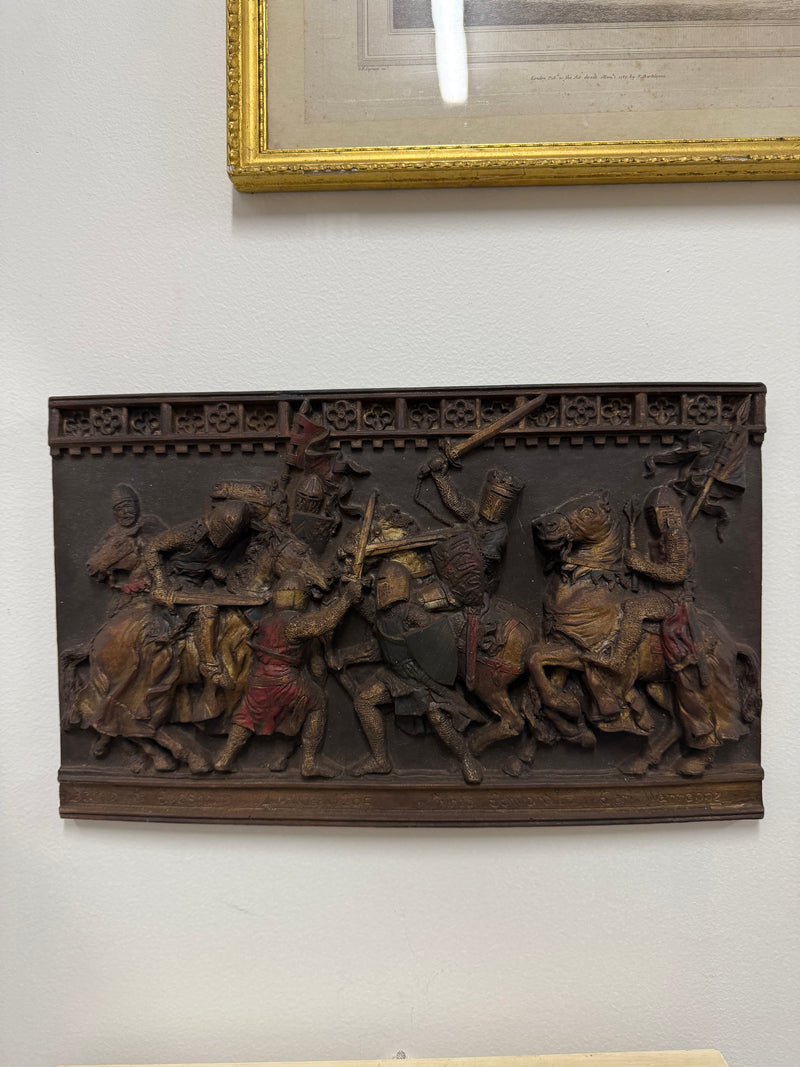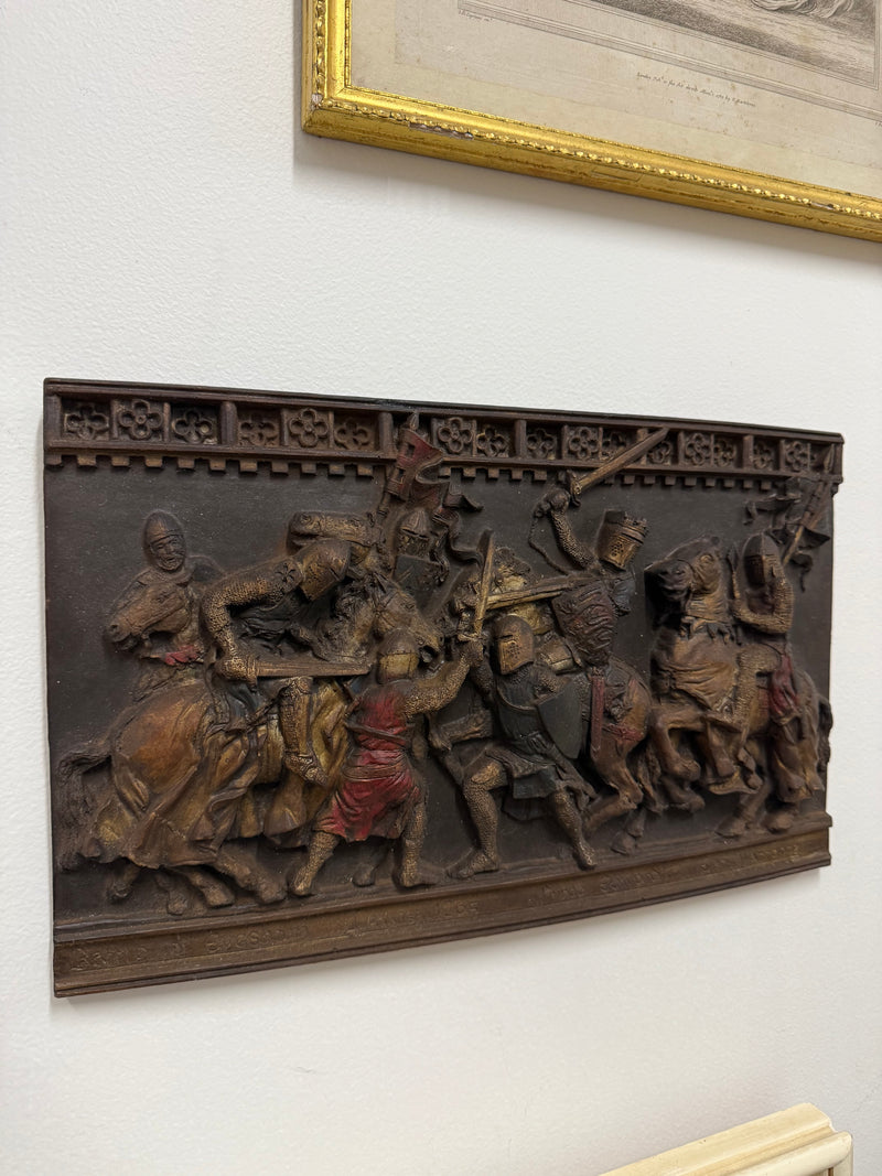 Vintage wall plaque featuring medieval battle of Eversham in 1265. In good original condition. Please see photos as they form part of the description.